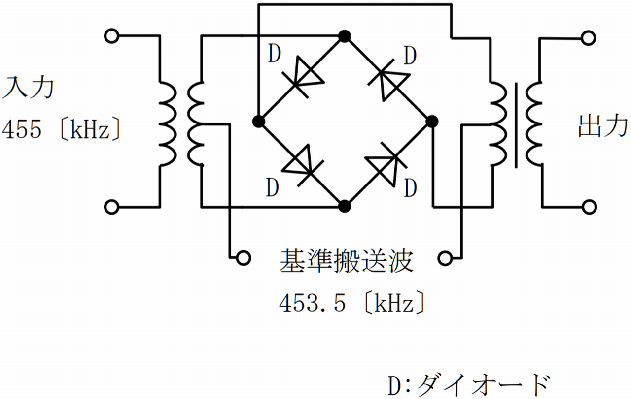 (2) 入力のSSB波の周波数が455〔kHz〕、基準搬送波の周波数が453.5〔kHz〕のとき、出力に現れる周波数成分は、 [B] である。